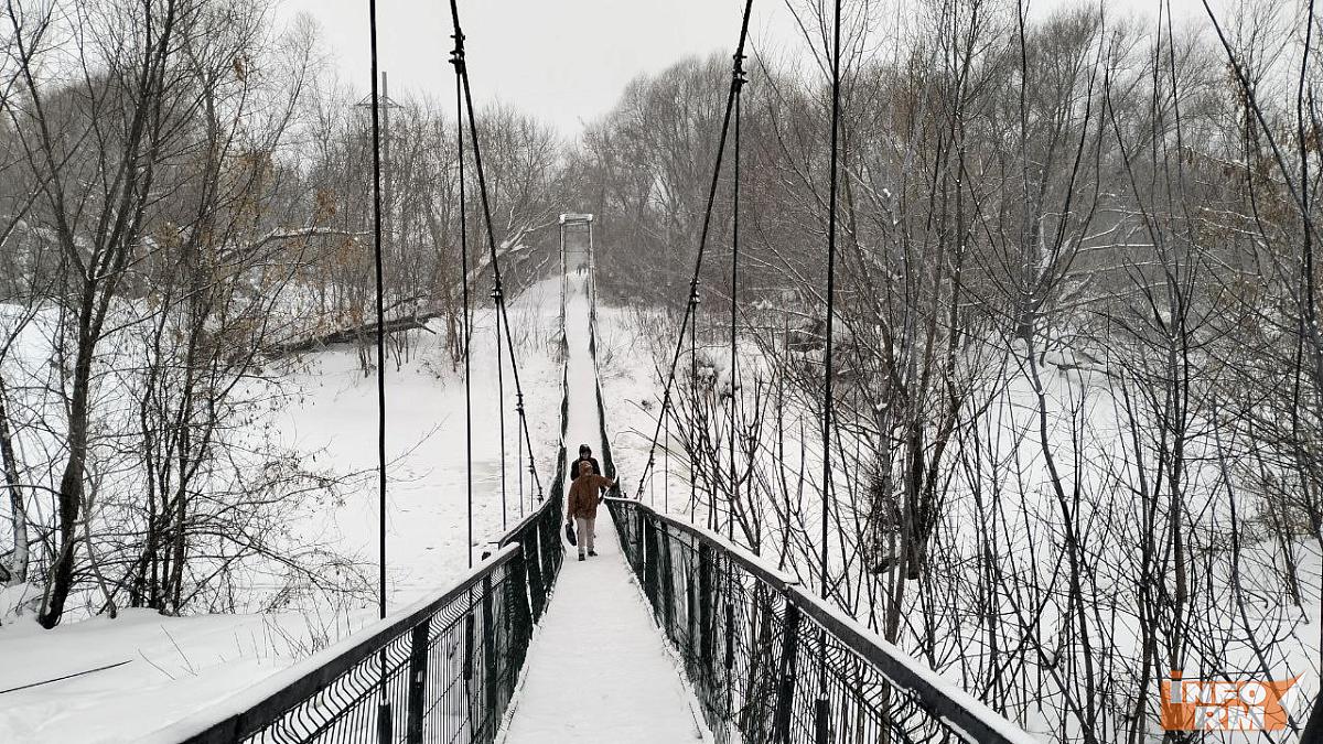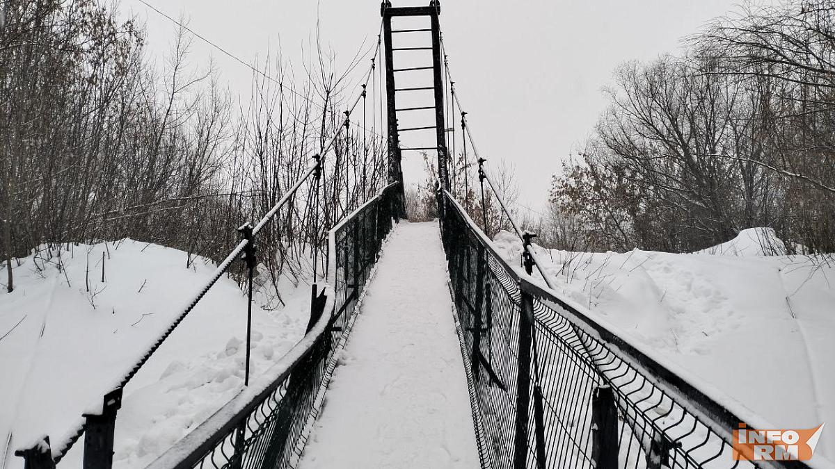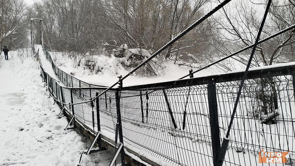 В столице Мордовии тяжести снега не выдержала конструкция подвесного моста через Инсар. Сейчас путепровод практически лежит на льду. И хотя сейчас мост очистили от снега, ходить по нему может быть небезопасно.