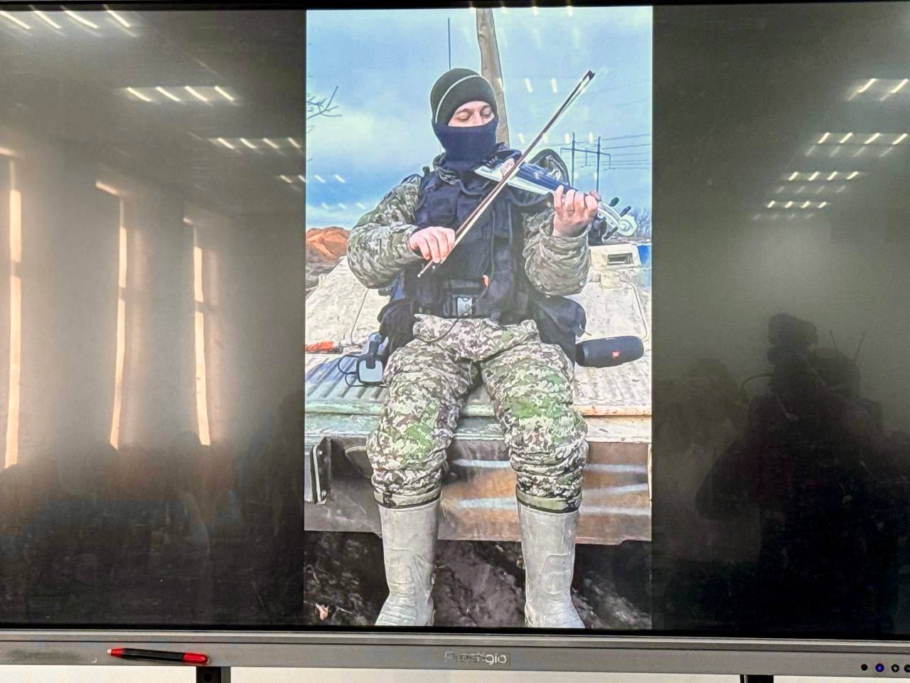Ветеран показал студентам репортаж и фотографии с фронта, ответил на вопросы о своём талисмане, поддержке близких и пережитых опасных моментах. В завершение встречи Денис исполнил на скрипке композицию «Палладио» Карла Дженкинса.
