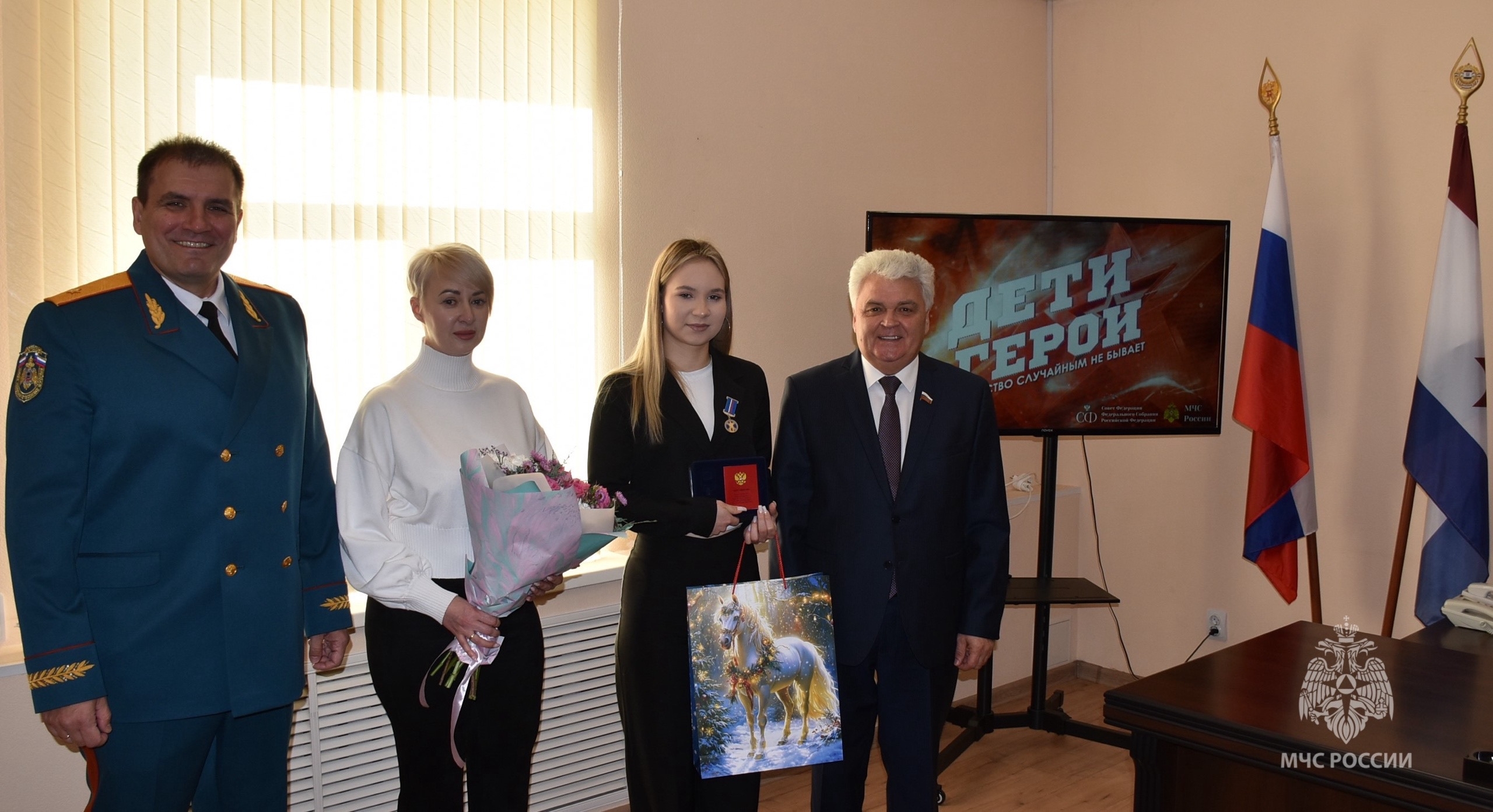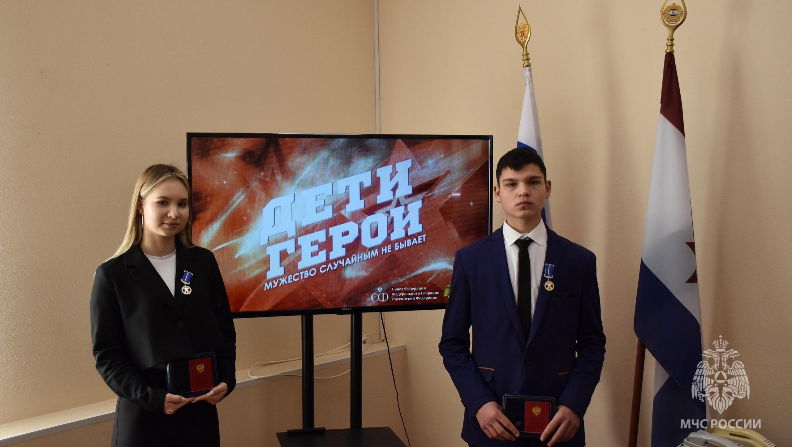 Сенатор Российской Федерации Пётр Тултаев и начальник ГУ МЧС России по РМ Сергей Репин вручили ребятам памятные медали Совета Федерации Федерального Собрания РФ «За проявленное мужество».