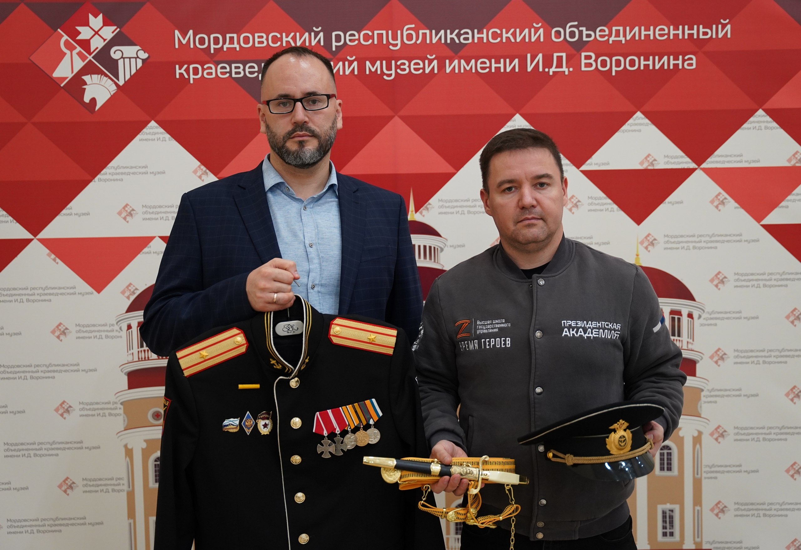 Фонды Мордовского республиканского краеведческого музея И.Д. Воронина сегодня пополнили ещё несколько предметов, связанных со специальной военной операцией. Герой СВО из Саранска Алексей Жбанов подарил свою парадную форму – гвардейский китель с орденами и медалями, офицерский кортик и фуражку.