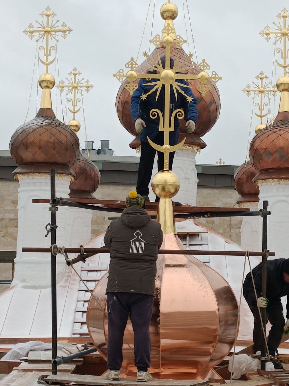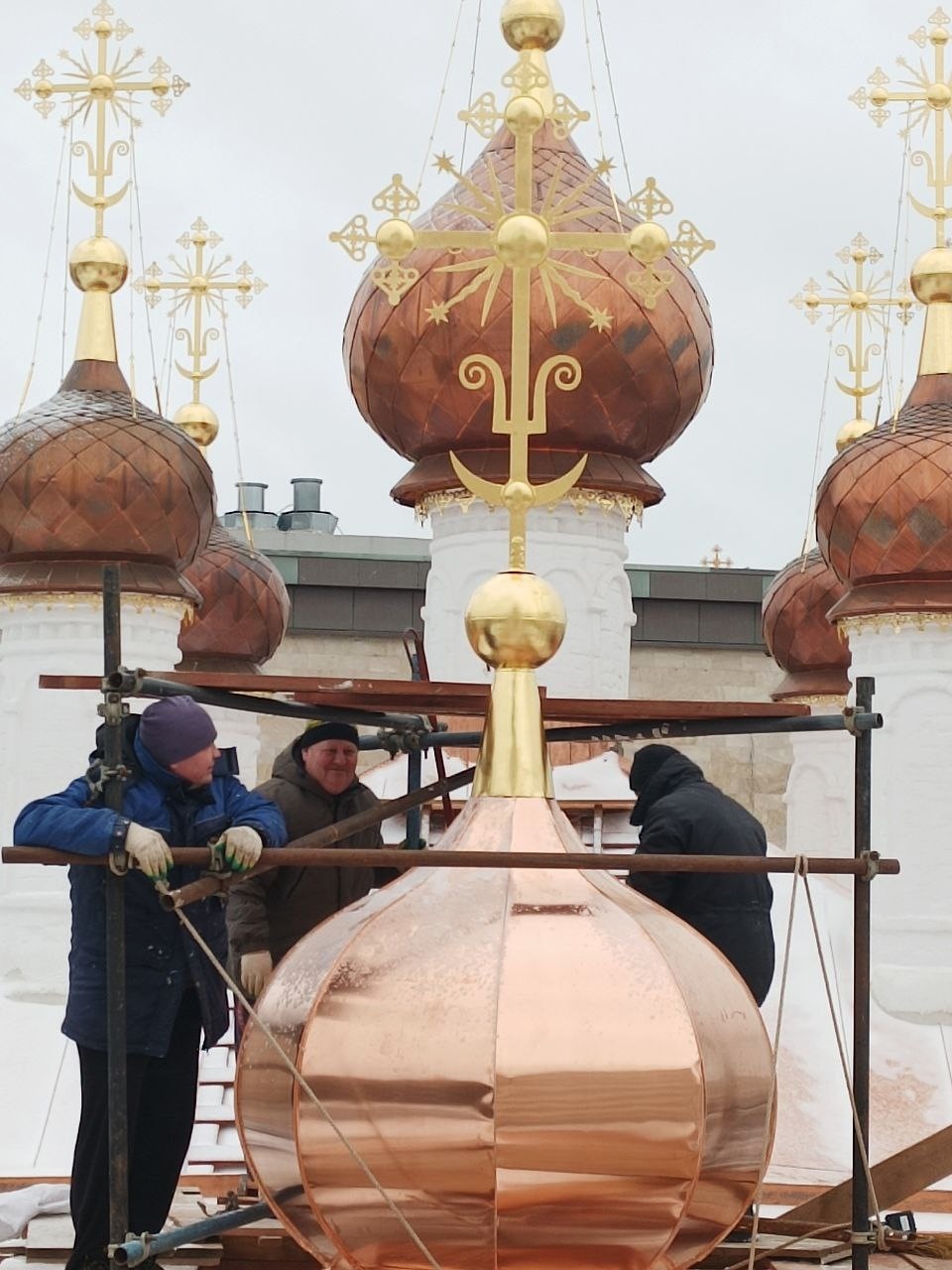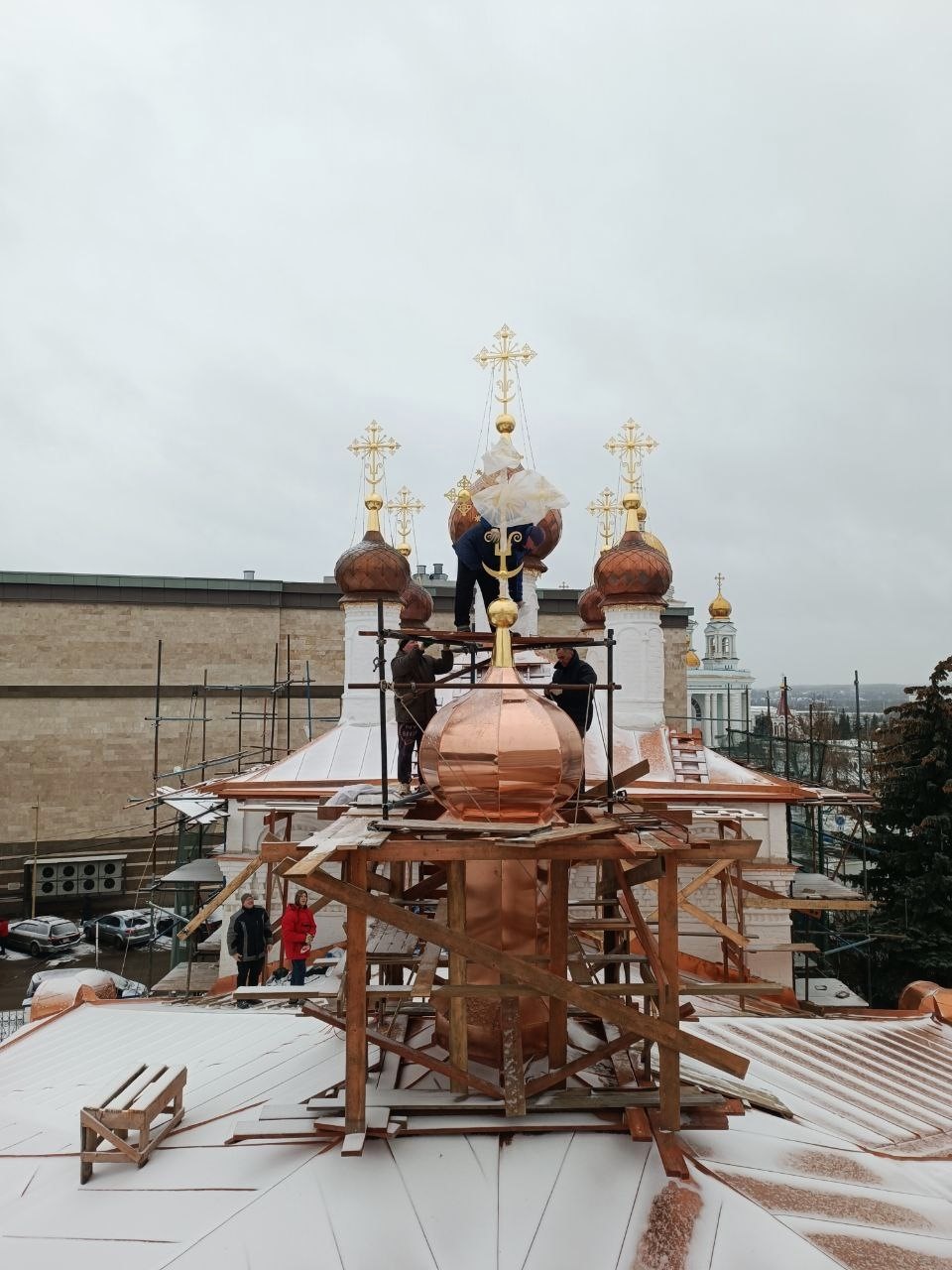 В Иоанно-Богословском соборе сейчас продолжаются масштабные работы по реставрации. Начавшие темнеть медные купола установили минувшим летом. А сверху их украшают покрытые сусальным золотом кресты. Вот они со временем темнее не станут.