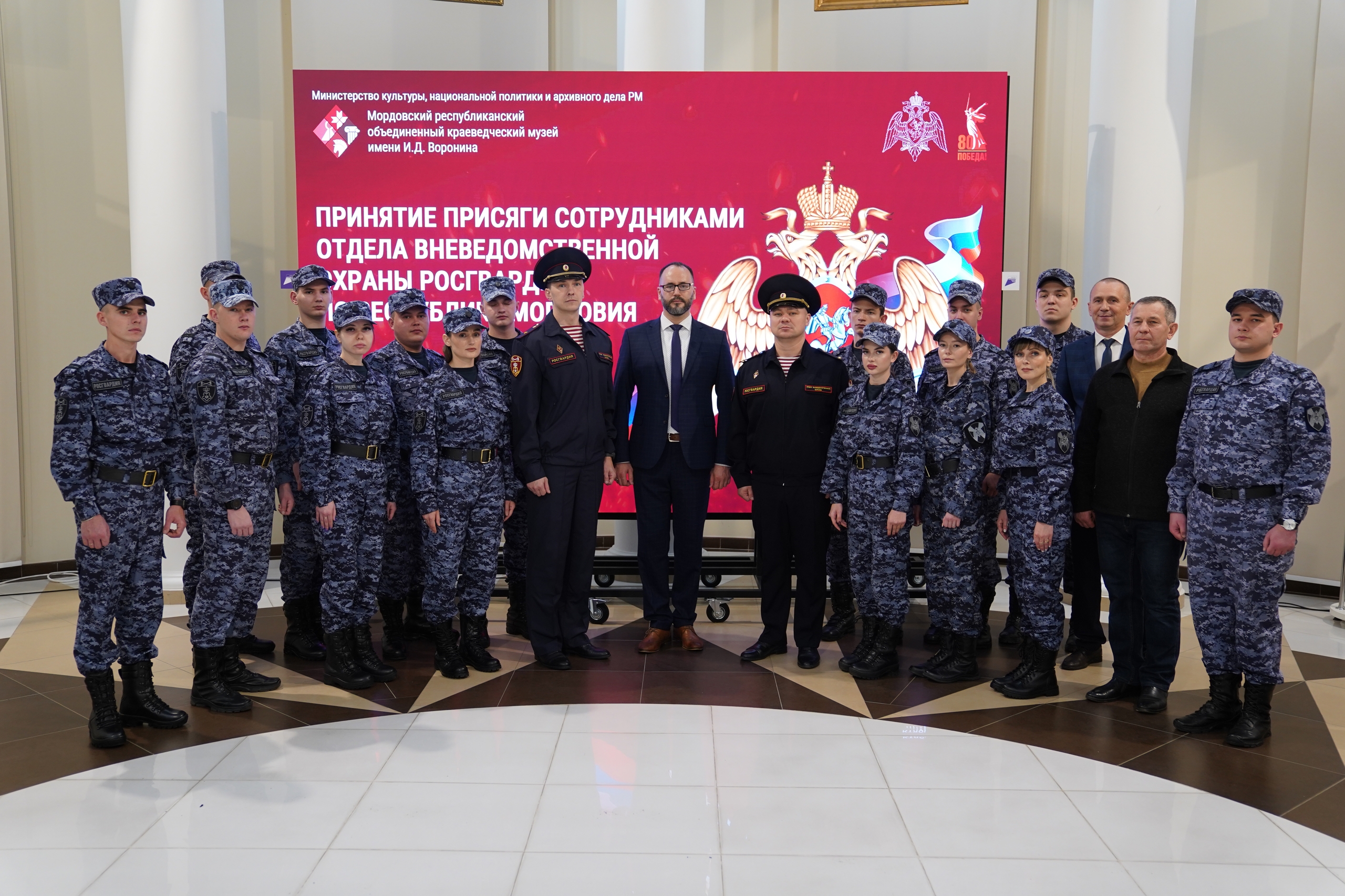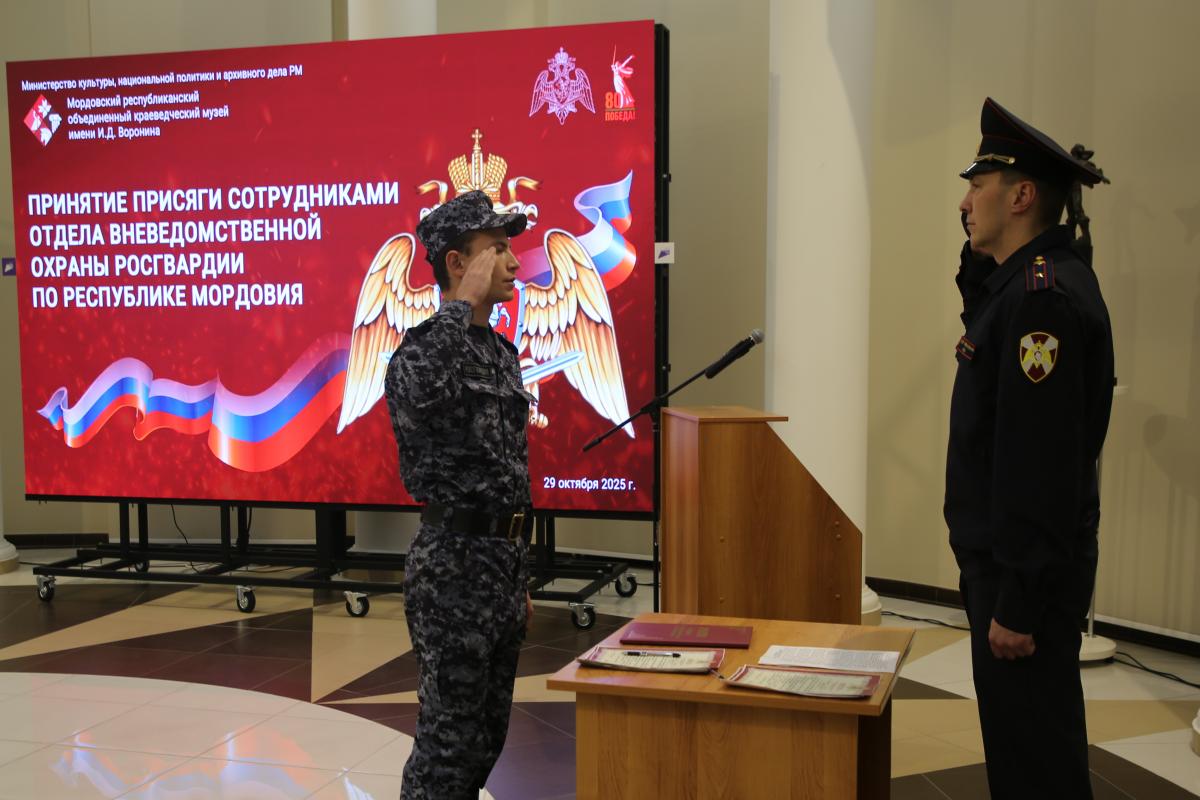 В День вневедомственной охраны войск национальной гвардии РФ два десятка молодых сотрудников Росгвардии принесли клятву быть верными Отечеству, соблюдать права граждан и не останавливаться перед лицом опасности. Торжественную церемонию провели в атриуме Мордовского краеведческого музея имени И.Д. Воронина.