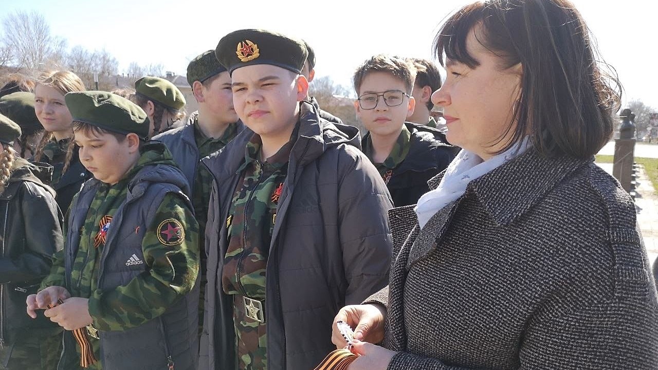 Поисковики, юнармейцы, кадеты и молодогвардейцы вручили символ Победы почётным гостям. Затем волонтёры Победы и активисты приступили к раздаче георгиевских ленточек жителям города.