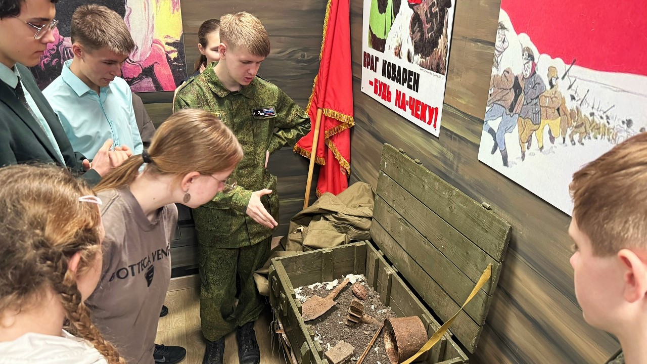 Также ребятам показали амуницию, снаряжение и вооружение солдат РККА. Им предложили определить на ощупь «взрывоопасные» предметы. Впервые они смогли открыть солдатский медальон и прочитать бумажный вкладыш, после чего информацию о солдате искали на сайтах ОБД «Мемориал» и «Память Народа».