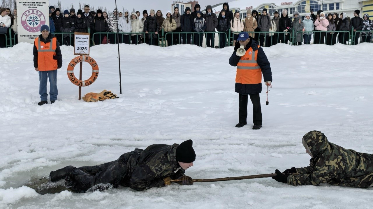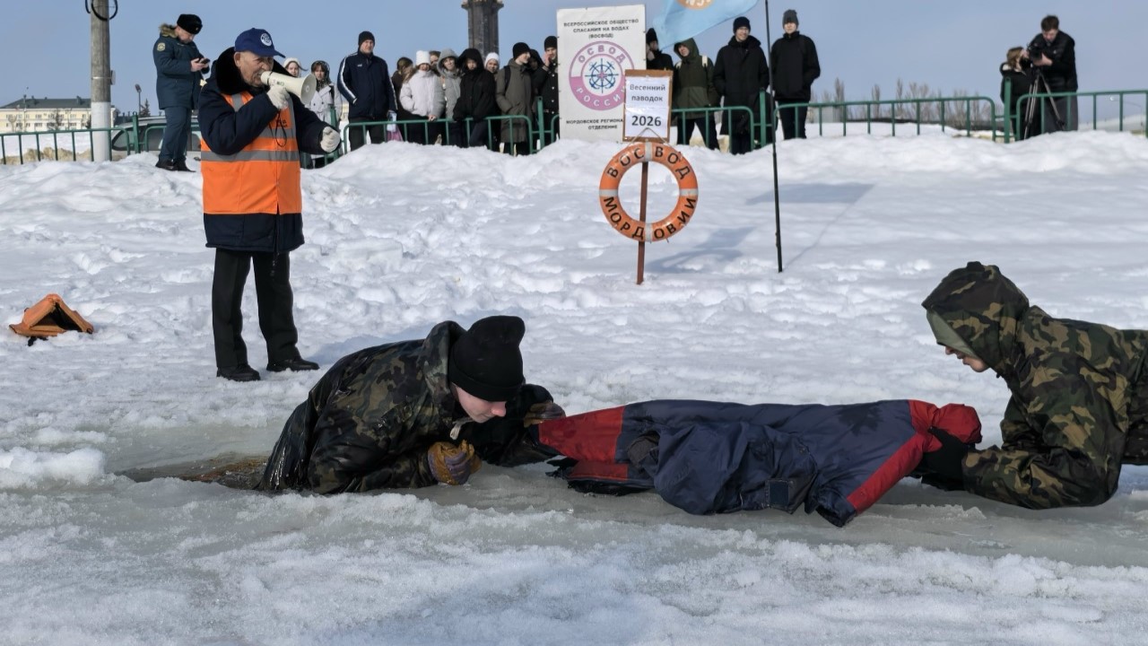 Председатель ВОСВОД Мордовии Валерий Евдокимов комментировал действия школьников. Жанна Дугушкина рассказала о том, что нужно делать «потерпевшему» после освобождения из «ледового плена».