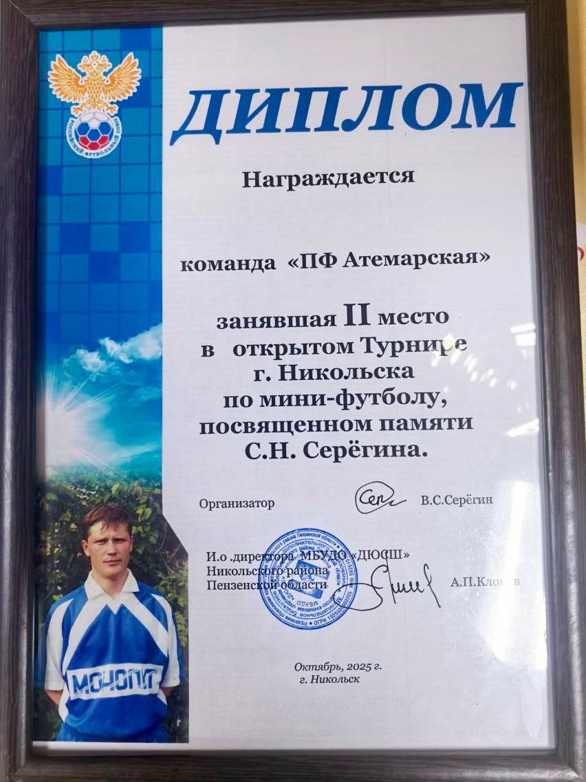 Мужская команда птицефабрики «Атемарской» завоевала серебро открытого турнира по мини-футболу. Соревнования прошли в Никольске Пензенской области 19 октября в физкультурно-оздоровительном комплексе «Олимп» ДЮСШ Никольского района и были посвящены памяти Сергея Серёгина, внёсшего большой вклад в развитие спорта в регионе.