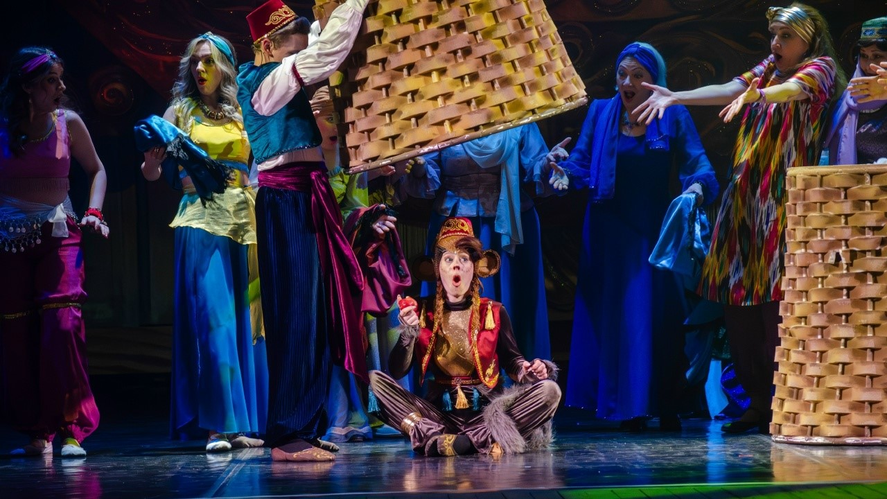 Восточную атмосферу создают не только знакомые персонажи, но и визуальная часть спектакля. Яркие костюмы, блеск тканей, золото и глубокие насыщенные цвета – всё работает на то, чтобы зритель с первых минут оказался в сказке.