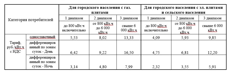 Для населения установлено три диапазона потребления. Первый диапазон предусматривает оплату по минимальному тарифу. Если объём потребления выходит за его пределы, то электроэнергия, потреблённая сверх этой границы, оплачивается по более высокой цене следующего диапазона.