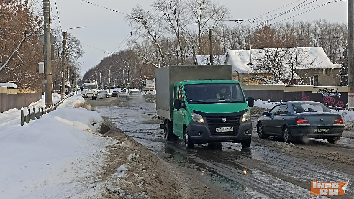 В столице Мордовии улицу А. Невского в четверг затопило водой. Вода стекала по проезжей части, образуя большие волны. Между ними пытались лавировать автомобили. Ситуацию осложняло то, что под водой находился гололёд.