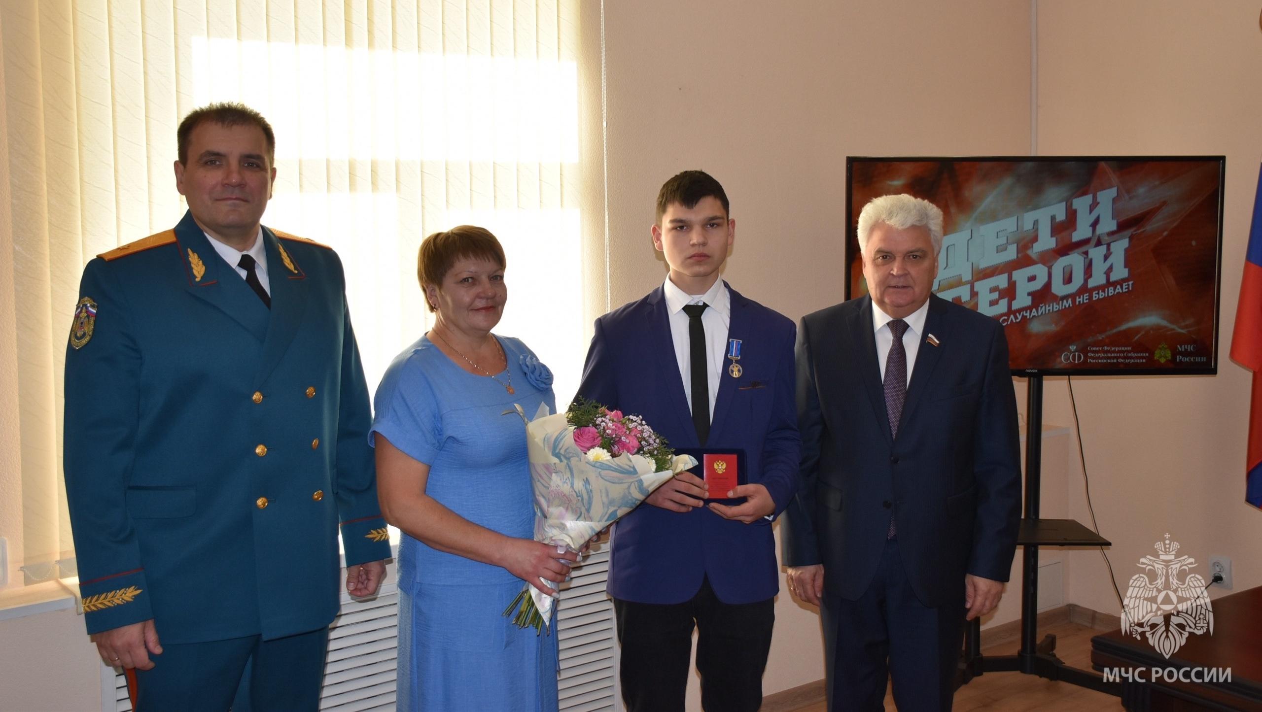 Сенатор Российской Федерации Пётр Тултаев и начальник ГУ МЧС России по РМ Сергей Репин вручили ребятам памятные медали Совета Федерации Федерального Собрания РФ «За проявленное мужество».