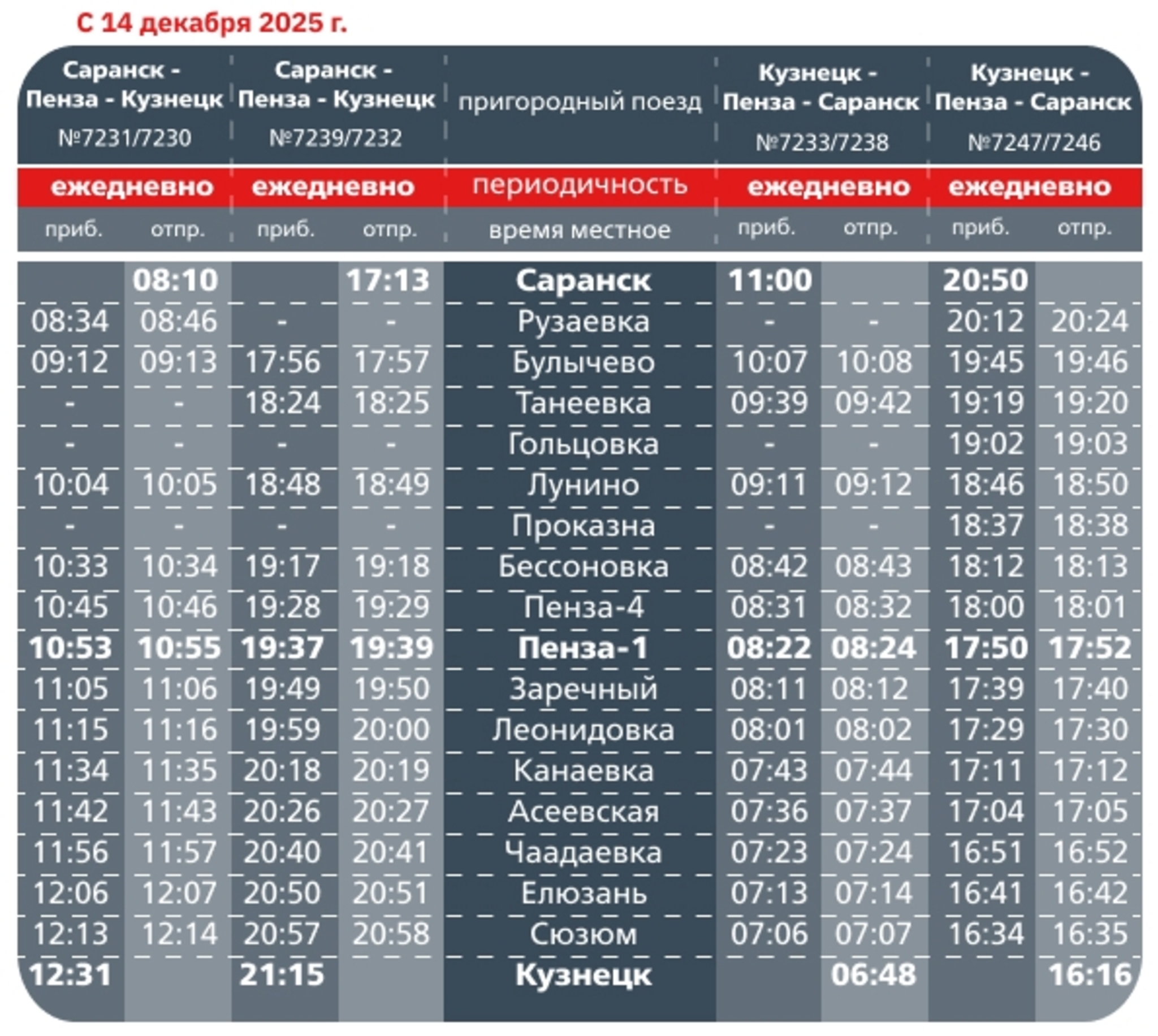 «№7233/7238 Кузнецк (отправление 6.48) – Пенза (прибытие 8.22, отправление 8.24) – Саранск (прибытие 11.00). №7247/7246 Кузнецк (отправление 16.16) – Пенза (прибытие 17.50, отправление 17.52) – Саранск (прибытие 20.50)», - отметили в Башкортостанской ППК.