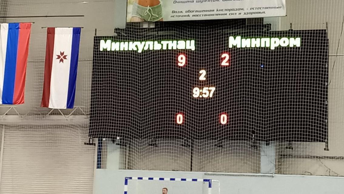 Команда Министерства культуры, национальной политики Мордовии и подведомственных учреждений сыграла с представителями Министерства промышленности, науки и новых технологий РМ. По итогам матча «культура» победила «науку» со счётом 9:2.
